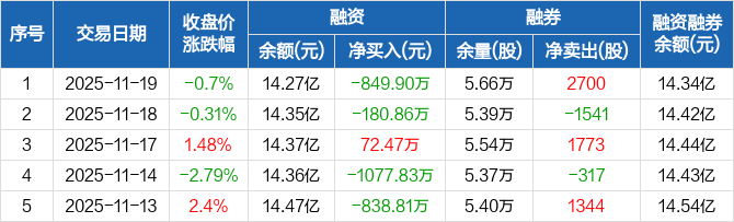 财富趋势:融资净偿还849.9万元,融资余额14.27亿元(11-19)
