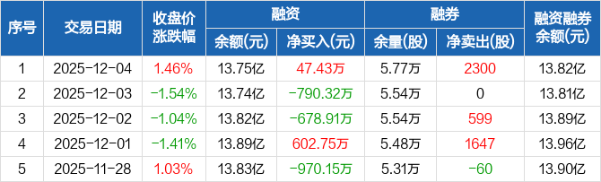 融资方面,当日融资买入4060.69万元,融资偿还4013.26万元,融资净买入47.43万元。融券方面,融券卖出2300股,融券偿还0股,融券余量5.77万股,融券余额731.36万元。融资融券余额合计13.82亿元。