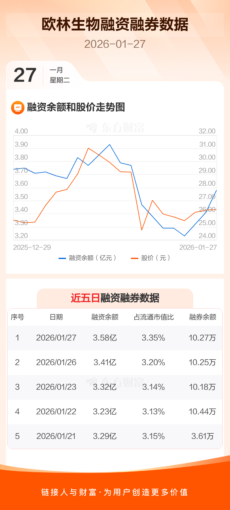 交易所最新数据显示,欧林生物于2026年1月27日获融资买入3240.95万元,融资偿还1567.24万元,当日融资净买入1673.72万元。目前,该股融资余额3.58亿,占流通市值比例为3.35%。