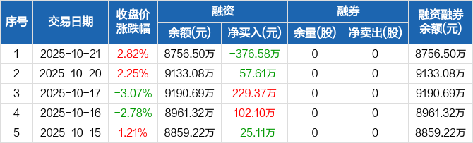 瑞华泰:融资净偿还376.58万元,融资余额8756.5万元(10-21)