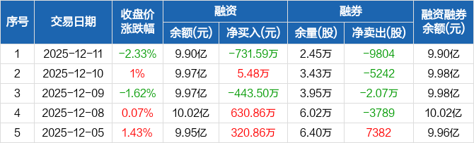 融资方面,当日融资买入1797.44万元,融资偿还2529.04万元,融资净偿还731.59万元。融券方面,融券卖出600股,融券偿还1.04万股,融券余量2.45万股,融券余额33.84万元。融资融券余额合计9.9亿元。