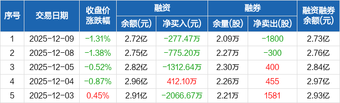 融资方面,当日融资买入2207.61万元,融资偿还2485.09万元,融资净偿还277.47万元,连续3日净偿还累计2365.31万元。融券方面,融券卖出0股,融券偿还1800股,融券余量2.09万股,融券余额129.36万元。融资融券余额合计2.73亿元。