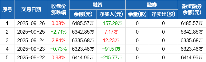博力威:融资净偿还157.29万元,融资余额6185.57万元(09-26)