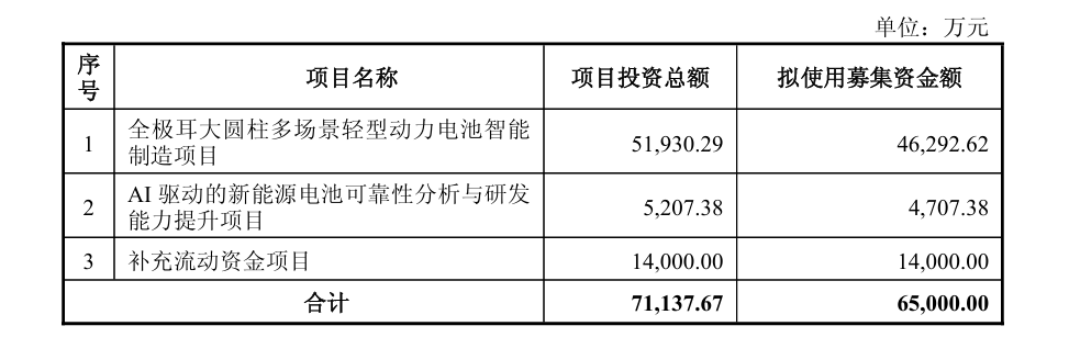 扣除相关发行费用后,博力威拟将募集资金净额中约4.63亿元用于全极耳大圆柱多场景轻型动力电池智能制造项目、4707.38万元用于AI驱动的新能源电池可靠性分析与研发能力提升项目、1.4亿元用于补充流动资金。