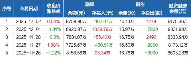 三一重能:融资净偿还162.07万元,融资余额8758.8万元(12-02)