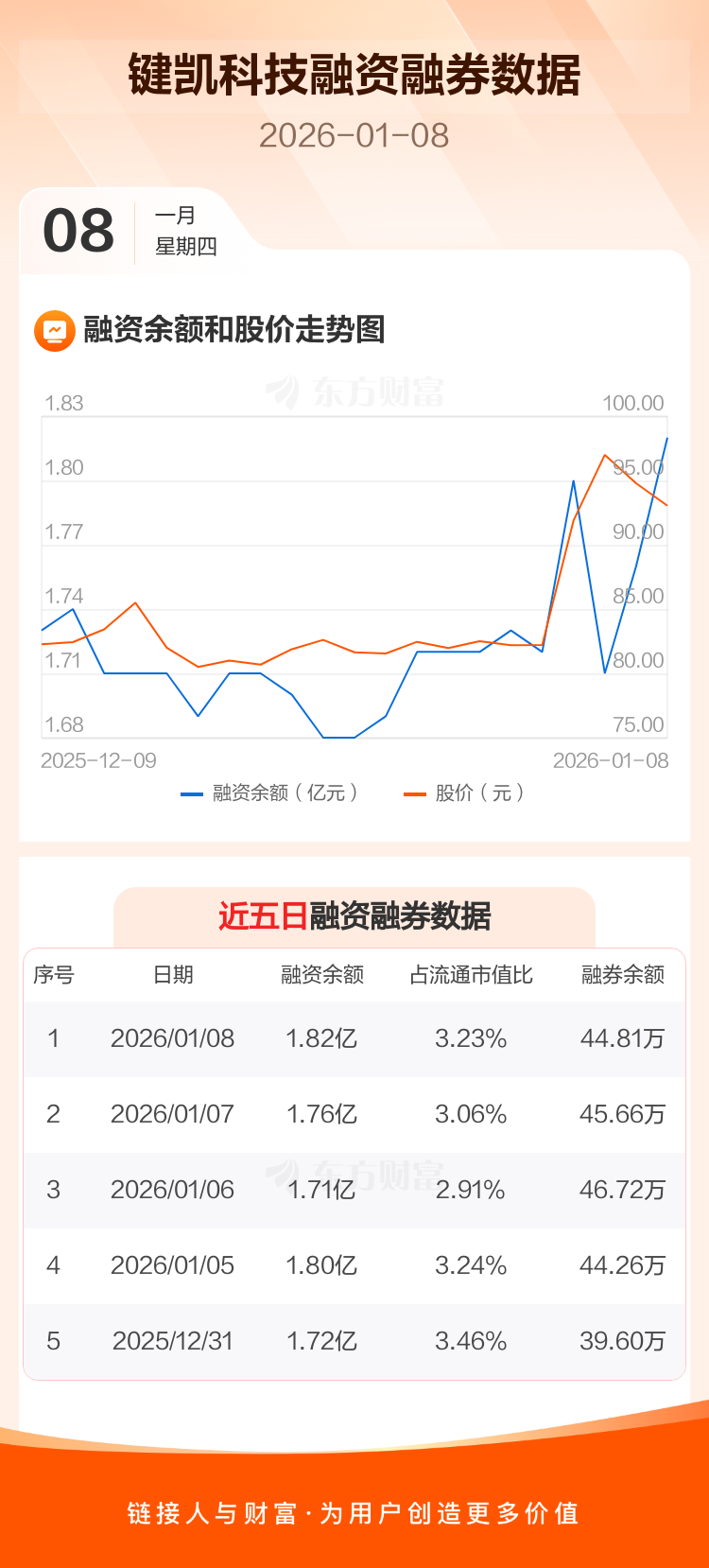 交易所最新数据显示,键凯科技于2026年1月8日获融资买入2926.16万元,融资偿还2319.38万元,当日融资净买入606.78万元。目前,该股融资余额1.82亿,占流通市值比例为3.23%。