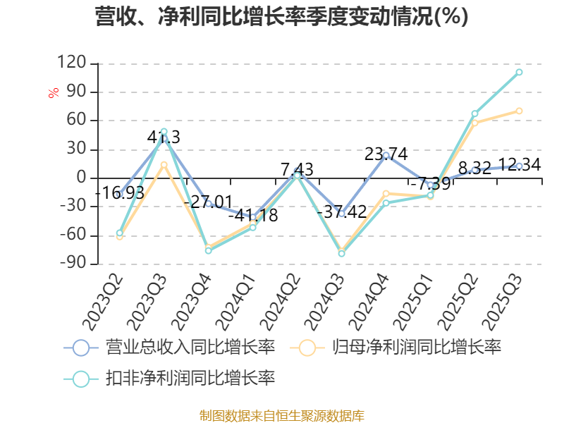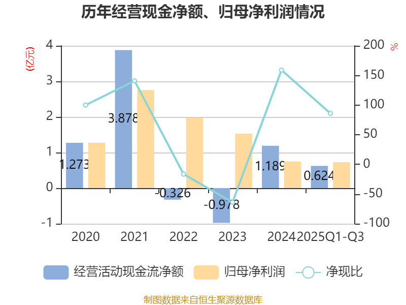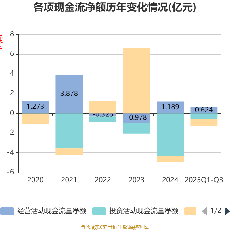 2025年前三季度,公司经营活动现金流净额为6240万元,同比增长24.14%;筹资活动现金流净额-6693.75万元,同比减少1044.58万元;投资活动现金流净额-5843.45万元,上年同期为-4.94亿元。