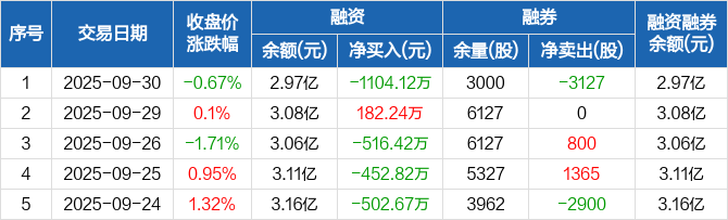 三孚新科:融资净偿还1104.12万元,融资余额2.97亿元(09-30)
