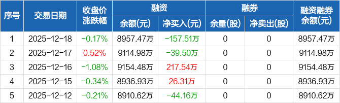 丛麟科技:融资净偿还157.51万元,融资余额8957.47万元(12-18)