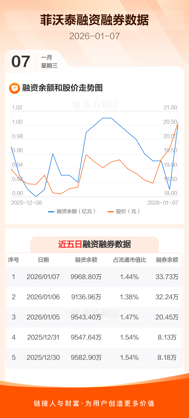 交易所最新数据显示,菲沃泰于2026年1月7日获融资买入1743.84万元,融资偿还912.01万元,当日融资净买入831.83万元。目前,该股融资余额9968.80万,占流通市值比例为1.44%。