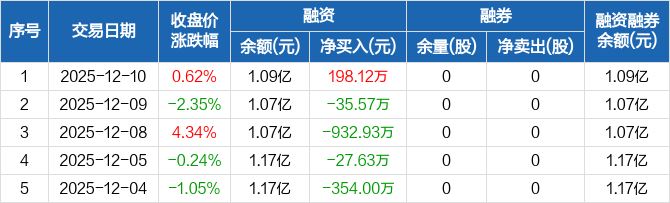 融资方面,当日融资买入592.2万元,融资偿还394.08万元,融资净买入198.12万元。融券方面,融券卖出0股,融券偿还0股,融券余量0股,融券余额0元。融资融券余额合计1.09亿元。