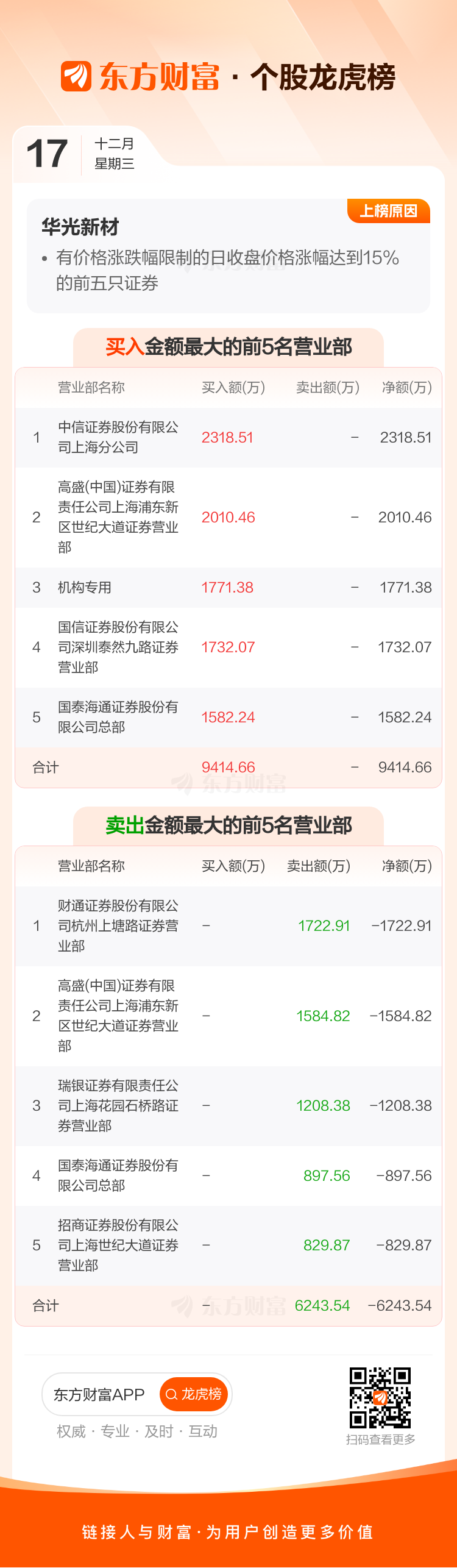 交易所2025年12月17日公布的交易公开信息显示,华光新材因成为有价格涨跌幅限制的日收盘价格涨幅达到15%的前五只证券上榜。华光新材当日收报55.3元,涨跌幅18.34%,偏离值18.34%,换手率11.80%,成交额5.70亿。