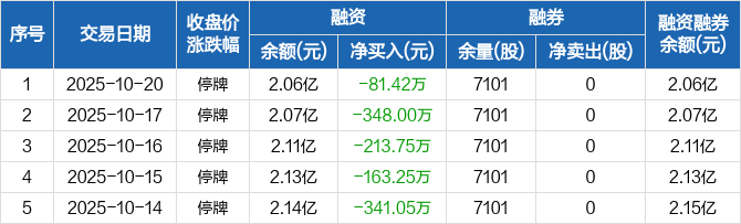 融资方面,当日融资买入0元,融资偿还81.42万元,融资净偿还81.42万元,连续11日净偿还累计3219.17万元。融券方面,融券卖出0股,融券偿还0股,融券余量7101股,融券余额19.96万元。融资融券余额合计2.06亿元。