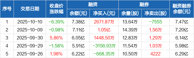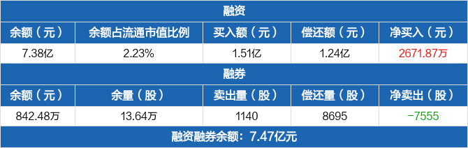 融资方面,当日融资买入1.51亿元,融资偿还1.24亿元,融资净买入2671.87万元,连续3日净买入累计1.47亿元。融券方面,融券卖出1140股,融券偿还8695股,融券余量13.64万股,融券余额842.48万元。融资融券余额合计7.47亿元。