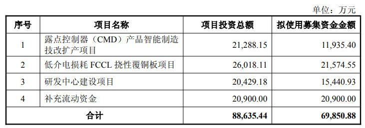 修订后的预案显示,公司拟募资不超过6.99亿元,用于露点控制器(CMD)产品智能制造技改扩产项目、低介电损耗FCCL挠性覆铜板项目、研发中心建设项目及补充流动资金。