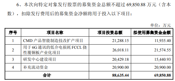 上一版预案显示,扣除费用后本次募资拟投向4个项目:CMD智能制造技改扩产(1.19亿元)、6G通信用低介电损耗FCCL挠性覆铜板产业化(2.16亿元)、研发中心建设(1.54亿元)及补充流动资金(2.09亿元)。
