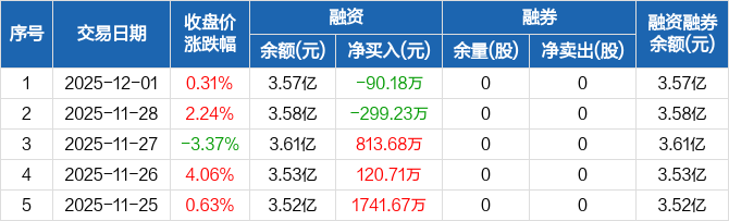 融资方面,当日融资买入1043.11万元,融资偿还1133.29万元,融资净偿还90.18万元。融券方面,融券卖出0股,融券偿还0股,融券余量0股,融券余额0元。融资融券余额合计3.57亿元。