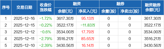 正弦电气:融资净买入95.13万元,融资余额3617.3万元(12-16)