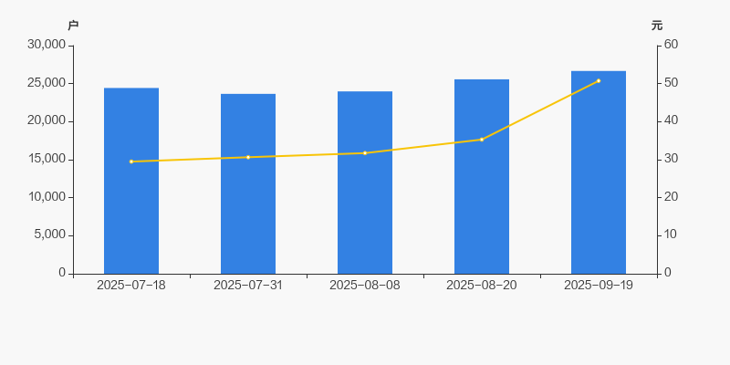 自2025年7月31日以来,公司股东户数连续3期上涨,截至目前增幅为12.73%。2025年7月31日至2025年9月19日区间股价上涨65.51%。