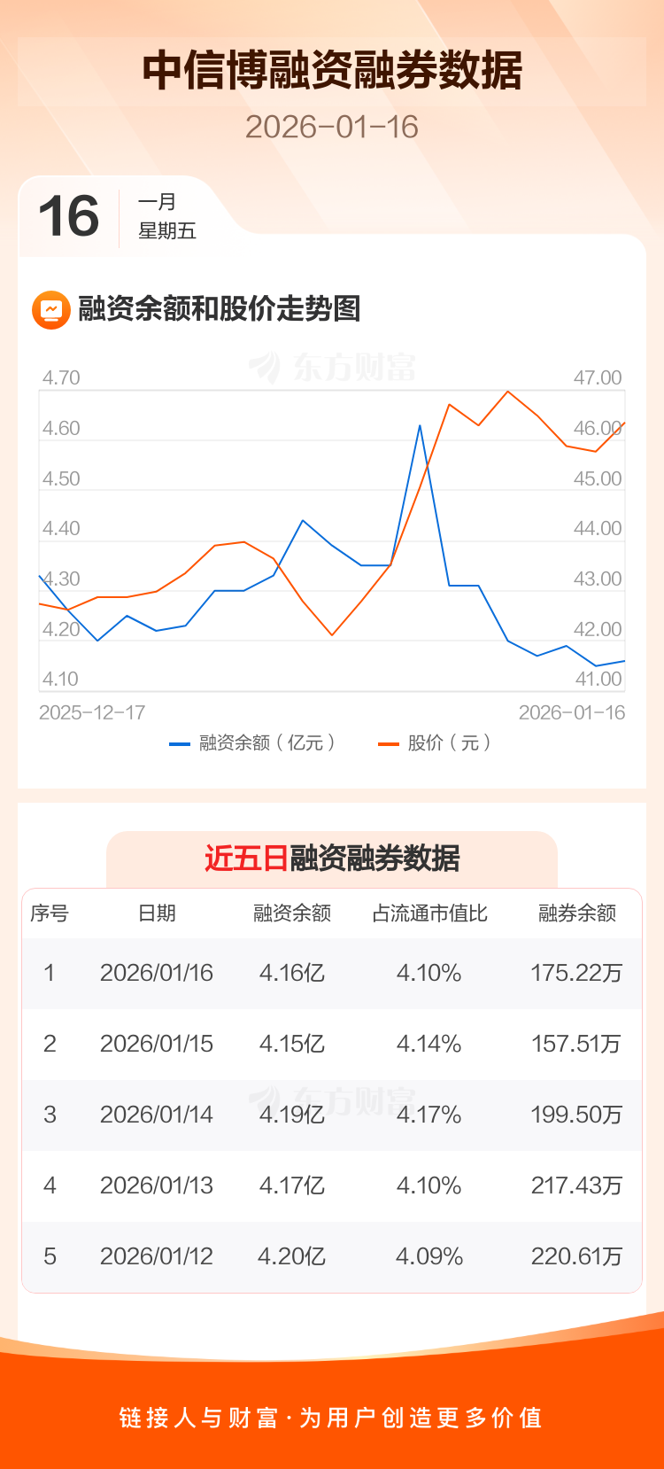 交易所最新数据显示,中信博于2026年1月16日获融资买入2213.48万元,融资偿还2097.11万元,当日融资净买入116.38万元。目前,该股融资余额4.16亿,占流通市值比例为4.10%。