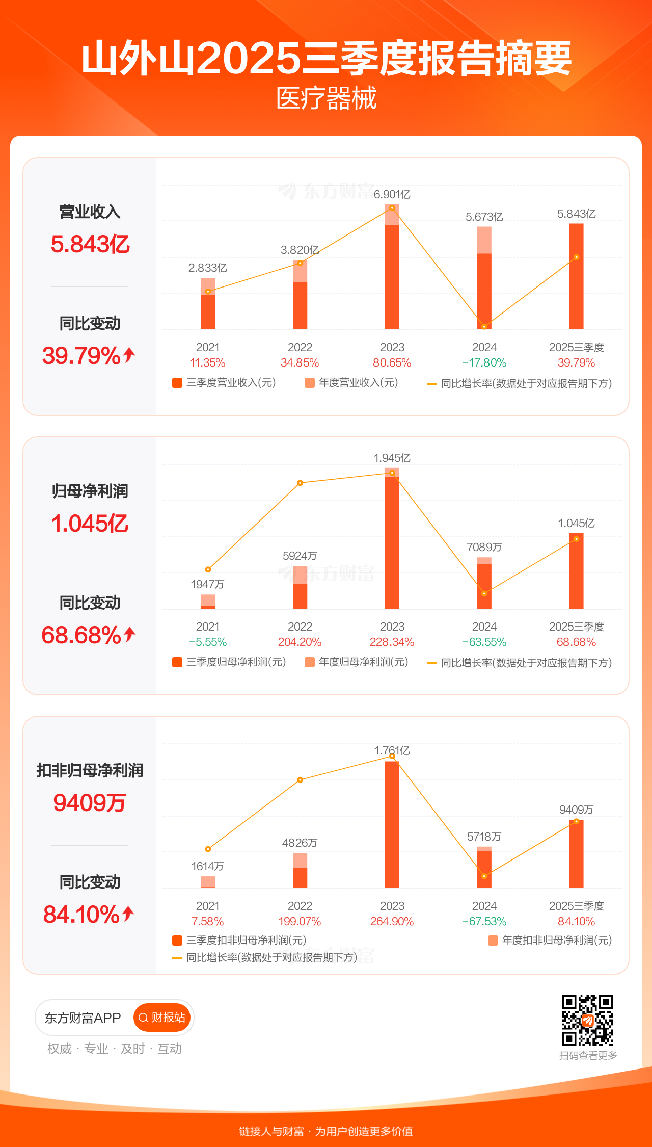 山外山10月29日发布2025年三季报显示,公司前三季实现营业收入5.84亿元,同比增长39.79%;归母净利润1.04亿元,同比增长68.68%;扣非归母净利润9408.68万元,同比增长84.10%。