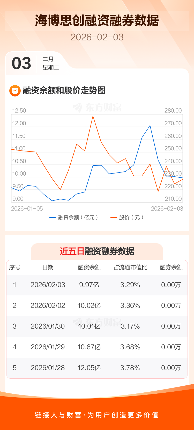 交易所最新数据显示,海博思创于2026年2月3日获融资买入1.28亿元,融资偿还1.34亿元,当日融资净偿还531.01万元。目前,该股融资余额9.97亿,占流通市值比例为3.29%。