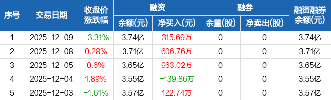 融资方面,当日融资买入1090.75万元,融资偿还775.06万元,融资净买入315.69万元,连续3日净买入累计1885.48万元。融券方面,融券卖出0股,融券偿还0股,融券余量0股,融券余额0元。融资融券余额合计3.74亿元。