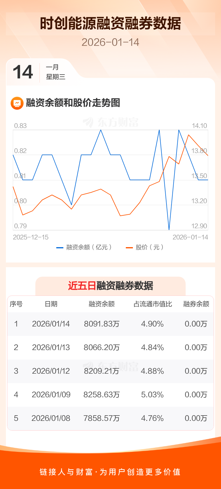 交易所最新数据显示,时创能源于2026年1月14日获融资买入427.03万元,融资偿还401.39万元,当日融资净买入25.63万元。目前,该股融资余额8091.83万,占流通市值比例为4.90%。