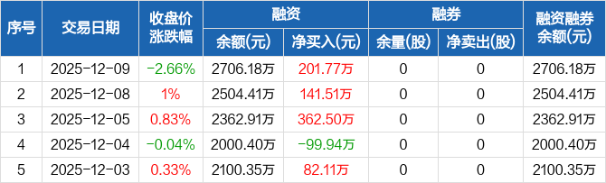 融资方面,当日融资买入394.14万元,融资偿还192.37万元,融资净买入201.77万元,连续3日净买入累计705.78万元。融券方面,融券卖出0股,融券偿还0股,融券余量0股,融券余额0元。融资融券余额合计2706.18万元。