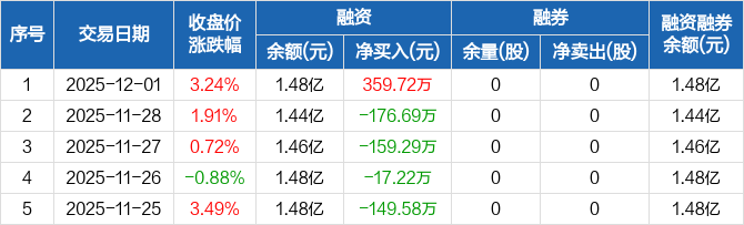 美芯晟:融资净买入359.72万元,融资余额1.48亿元(12-01)