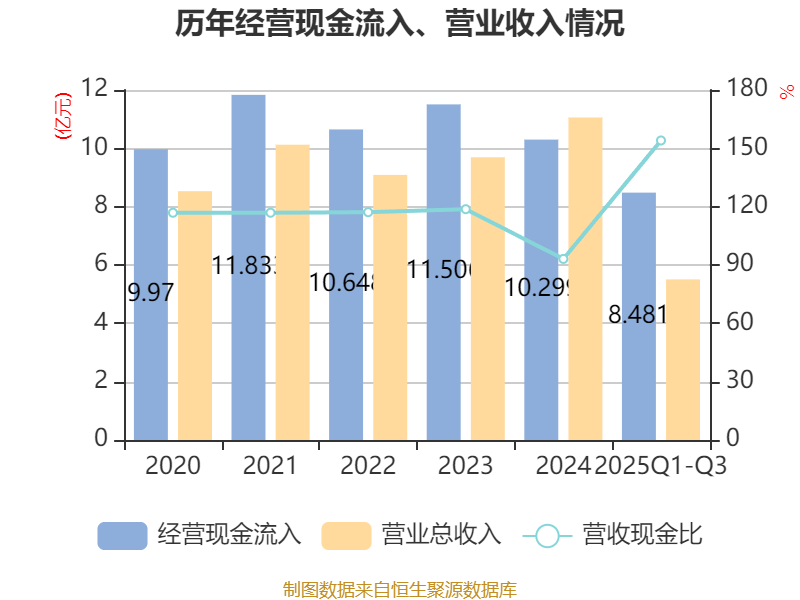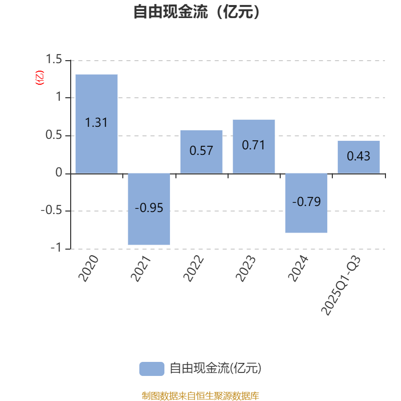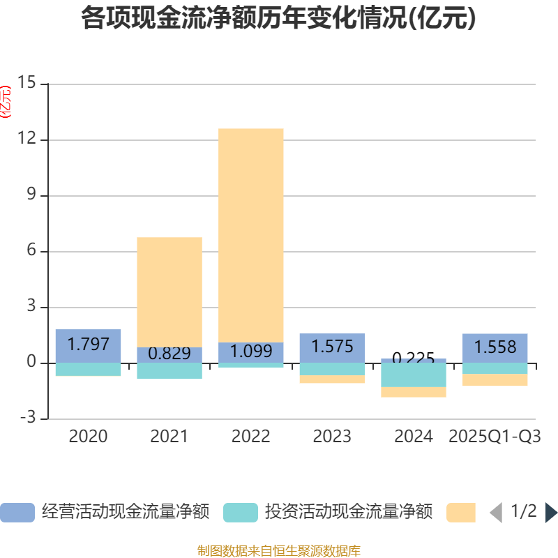 2025年前三季度,公司经营活动现金流净额为1.56亿元,同比增长934.02%;筹资活动现金流净额-6319.46万元,同比减少1429.98万元;投资活动现金流净额-6093.98万元,上年同期为-9900.36万元。