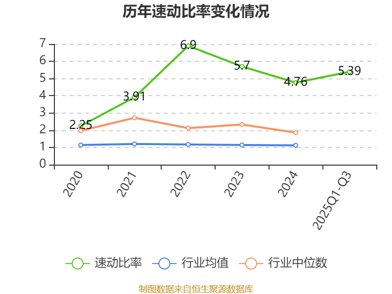 2025年前三季度,公司流动比率为6.31,速动比率为5.39。