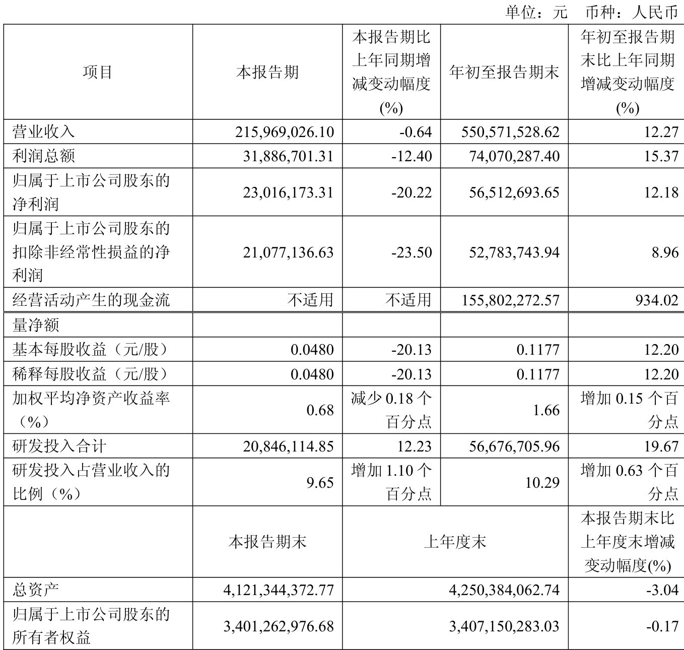 中证智能财讯哈铁科技(688459)10月30日披露2025年第三季度报告。前三季度公司实现营业总收入5.51亿元,同比增长12.27%;归母净利润5651.27万元,同比增长12.18%;扣非净利润5278.37万元,同比增长8.96%;经营活动产生的现金流量净额为1.56亿元,同比增长934.02%;报告期内,哈铁科技基本每股收益为0.1177元,加权平均净资产收益率为1.66%。