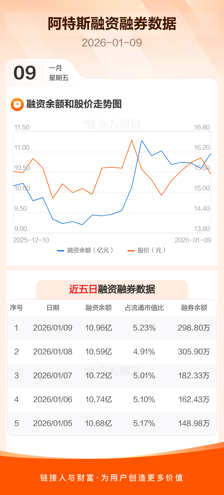 交易所最新数据显示,阿特斯于2026年1月9日获融资买入2.18亿元,融资偿还1.81亿元,当日融资净买入3712.18万元。目前,该股融资余额10.96亿,占流通市值比例为5.23%。