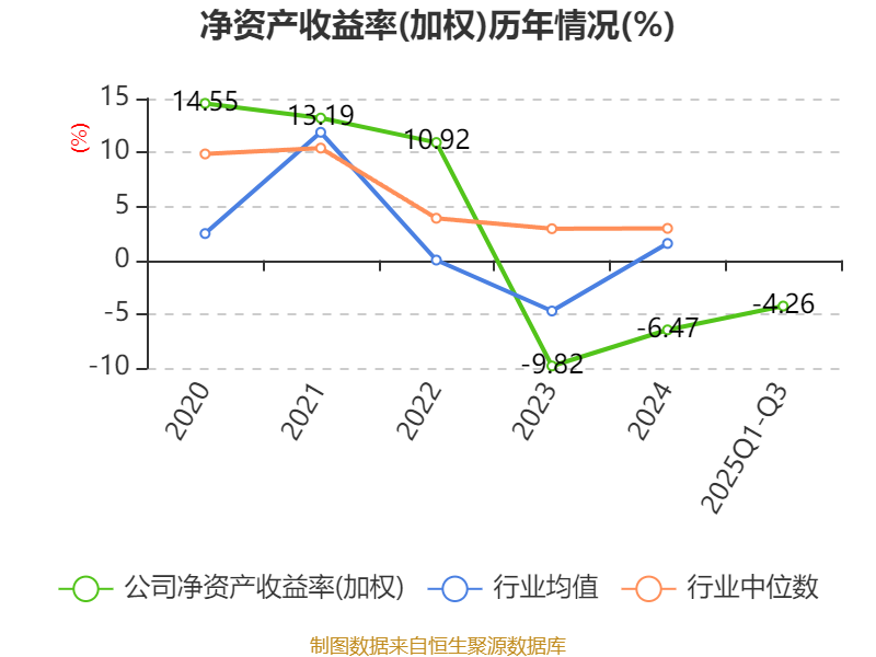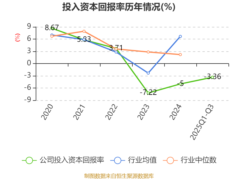 盈利能力方面, 2025年前三季度公司加权平均净资产收益率为-4.26%,同比上升0.23个百分点。公司2025年前三季度投入资本回报率为-3.36%,较上年同期持平。