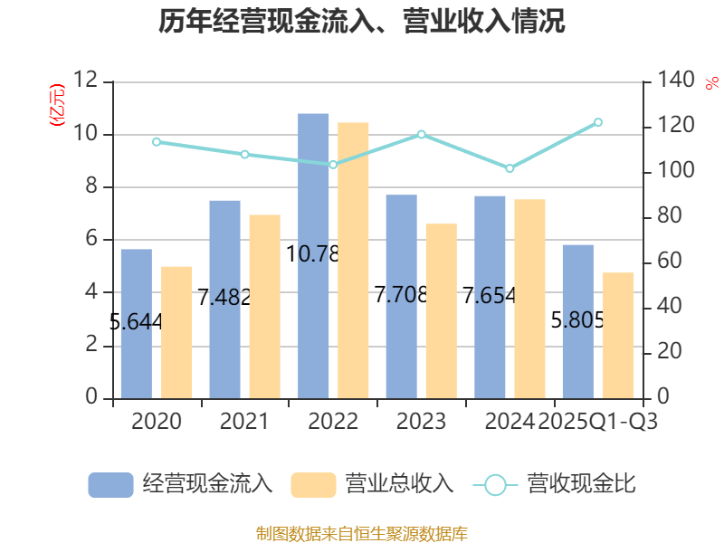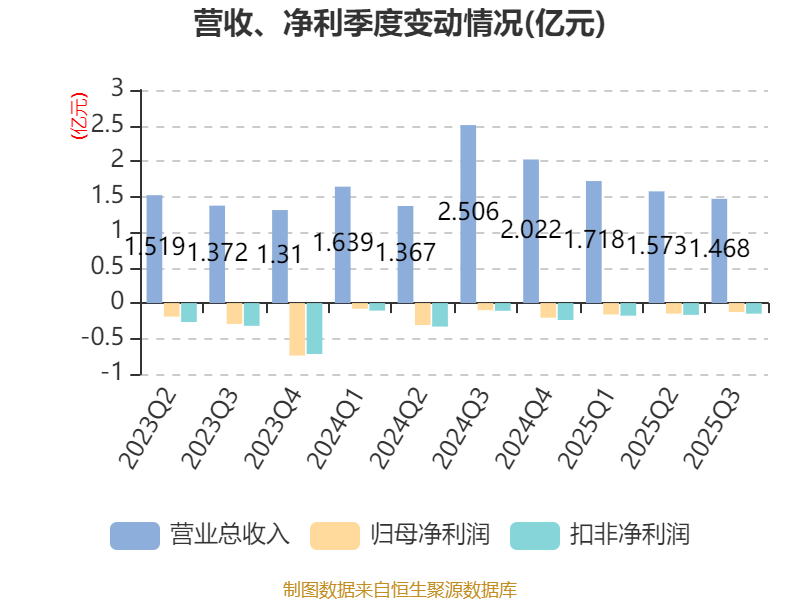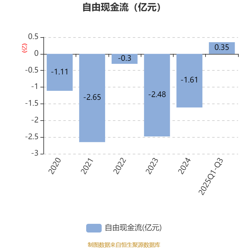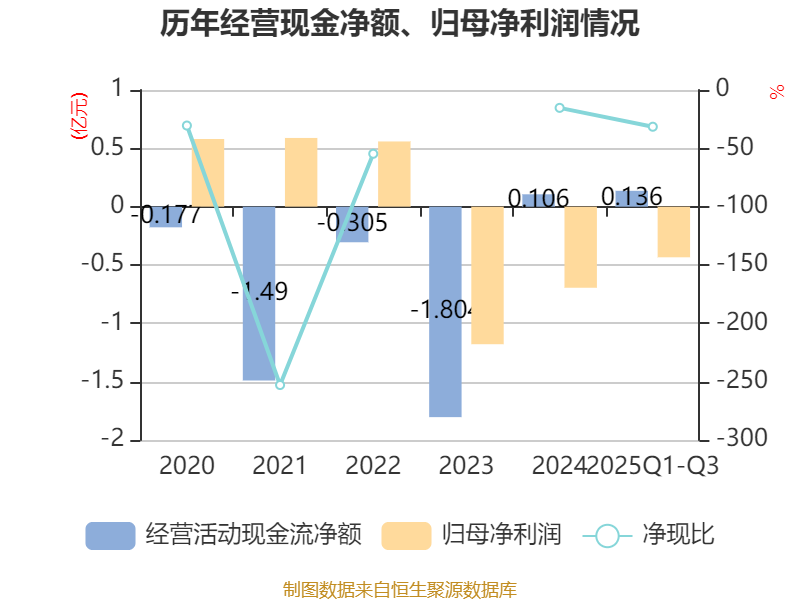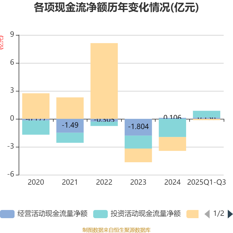 2025年前三季度,公司经营活动现金流净额为1364.71万元,同比增加4990.59万元;筹资活动现金流净额-1387.65万元,同比增加8700.26万元;投资活动现金流净额7273.98万元,上年同期为-1.45亿元。