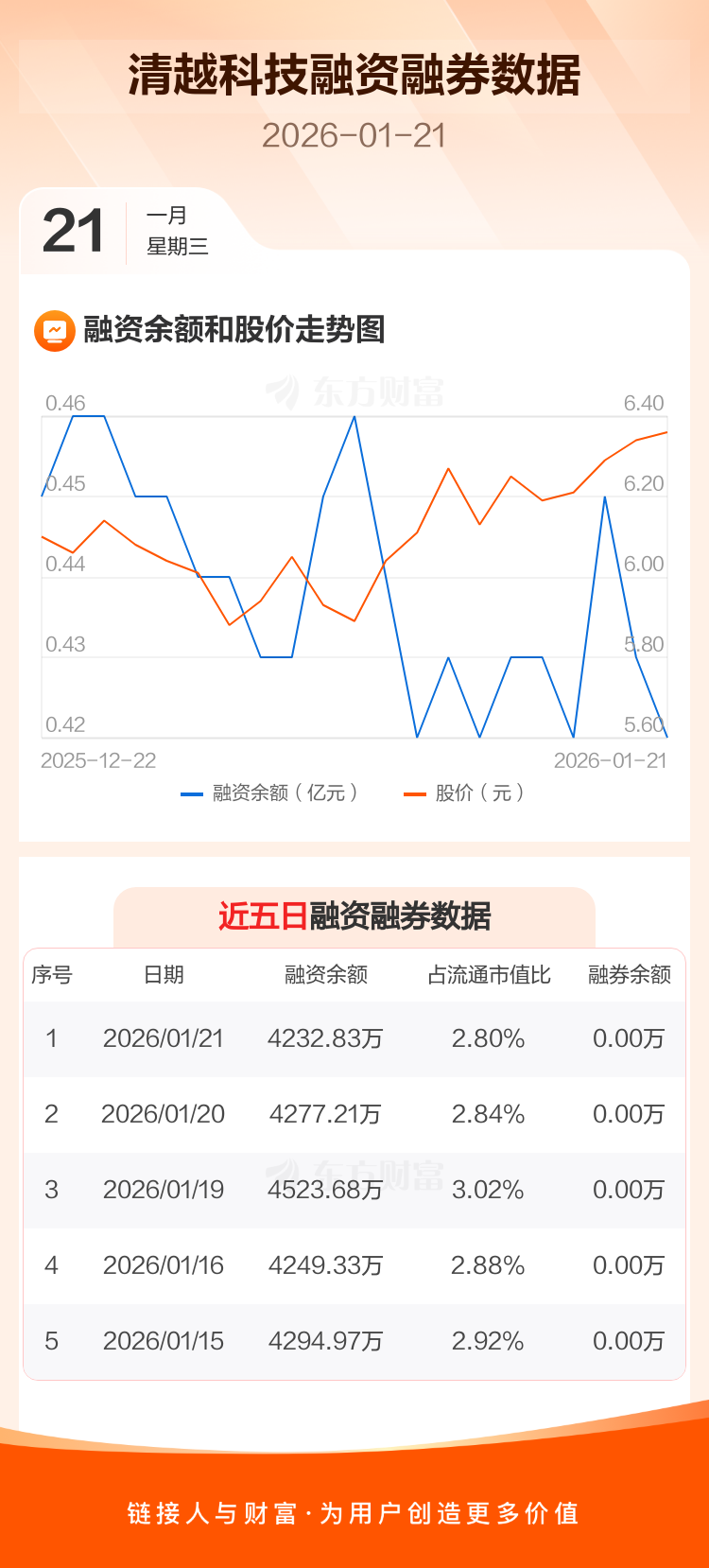 交易所最新数据显示,清越科技于2026年1月21日获融资买入100.80万元,融资偿还145.18万元,当日融资净偿还44.38万元。目前,该股融资余额4232.83万,占流通市值比例为2.80%。