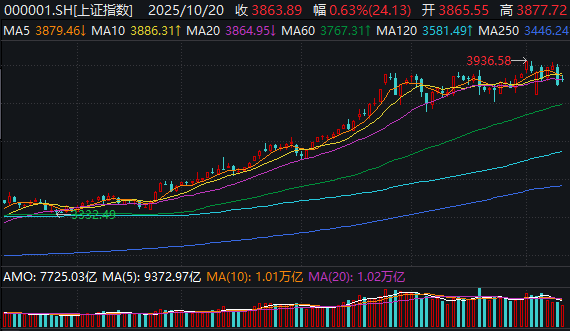 截至10月20日收盘,上证指数报收3863.89点,涨0.63%;深证成指报收12813.21点,涨0.98%;创业板指报收2993.45点,涨1.98%。沪深两市合计成交额为17513亿元,全天共有逾4000只个股上涨,其中,涨停个股数量达95只,跌停个股数量为6只。