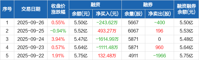 芯朋微:融资净偿还243.62万元,融资余额5.5亿元(09-26)