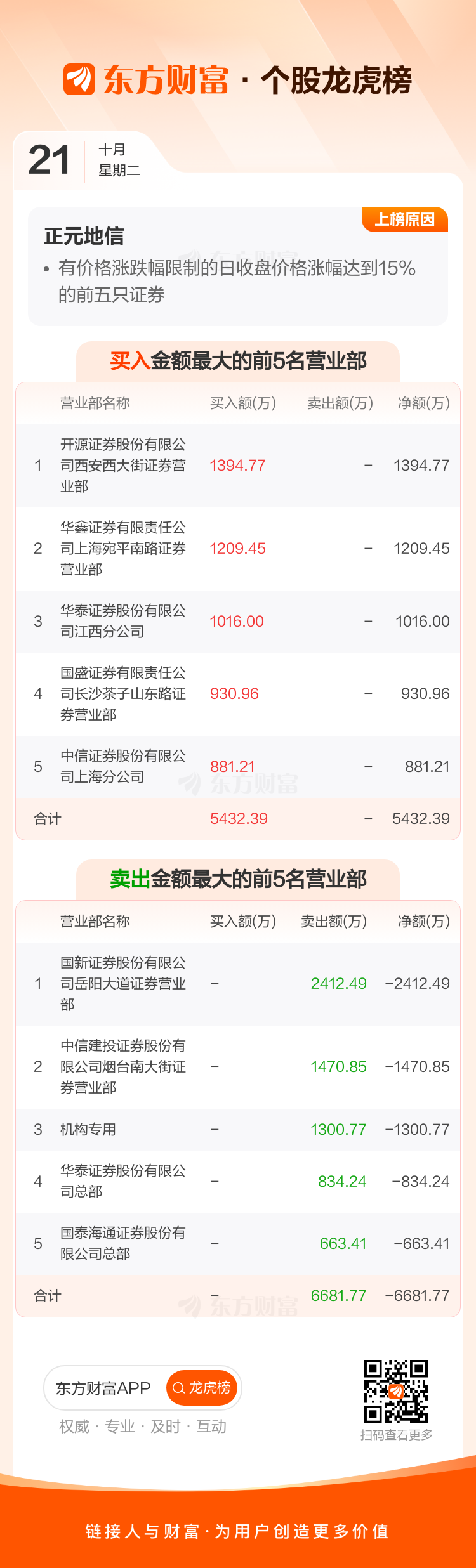 交易所2025年10月21日公布的交易公开信息显示,正元地信因成为有价格涨跌幅限制的日收盘价格涨幅达到15%的前五只证券上榜。正元地信当日收报5.08元,涨跌幅20.09%,偏离值20.09%,换手率19.66%,成交额3.68亿。
