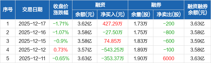纳睿雷达:融资净买入427.29万元,融资余额3.62亿元(12-17)
