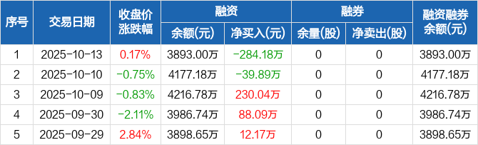 秦川物联:融资净偿还284.18万元,融资余额3893万元(10-13)