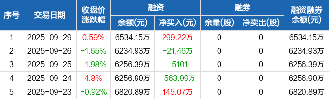 欧莱新材:融资净买入299.22万元,融资余额6534.15万元(09-29)