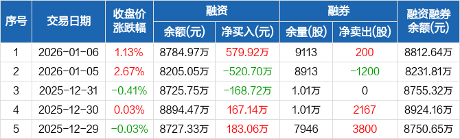 上声电子:融资净买入579.92万元,融资余额8784.97万元(01-06)