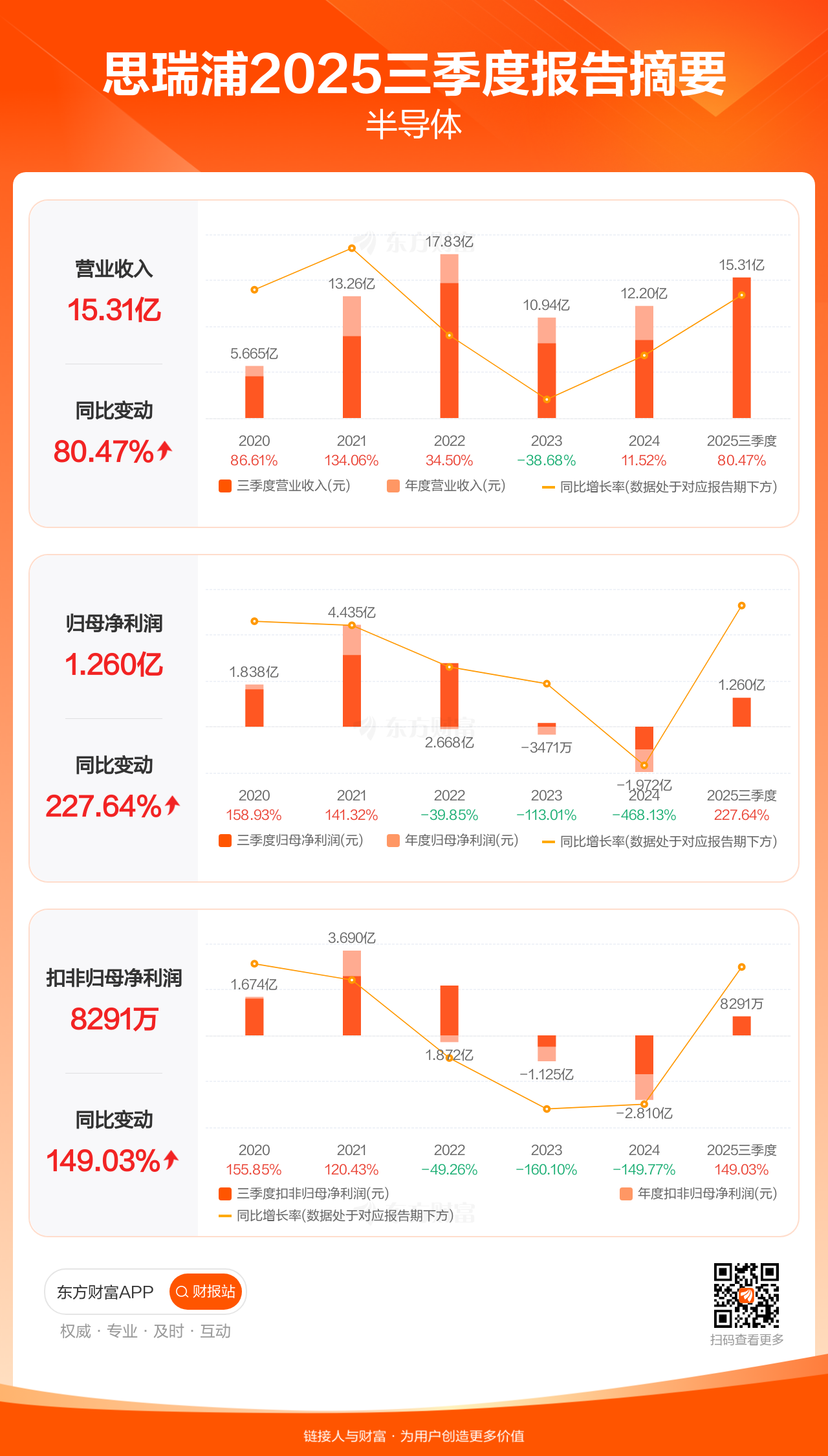 思瑞浦10月29日发布2025年三季报显示,公司前三季实现营业收入15.31亿元,同比增长80.47%;归母净利润1.26亿元,同比增长227.64%;扣非归母净利润8290.90万元,同比增长149.03%。