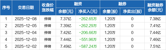 融资方面,当日融资买入0元,融资偿还262.65万元,融资净偿还262.65万元,连续9日净偿还累计4581.86万元。融券方面,融券卖出0股,融券偿还0股,融券余量1.2万股,融券余额177.93万元。融资融券余额合计7.38亿元。