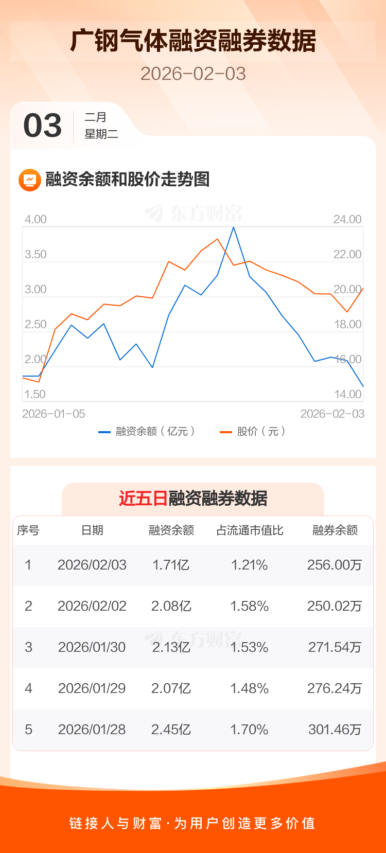 交易所最新数据显示,广钢气体于2026年2月3日获融资买入2947.70万元,融资偿还6703.31万元,当日融资净偿还3755.61万元。目前,该股融资余额1.71亿,占流通市值比例为1.21%。