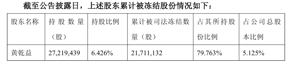 值得注意的是,黄乾益累计被司法冻结2171.11万股,占其所持股份比例为79.763%。
