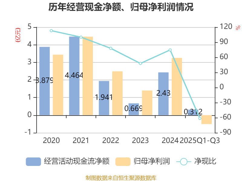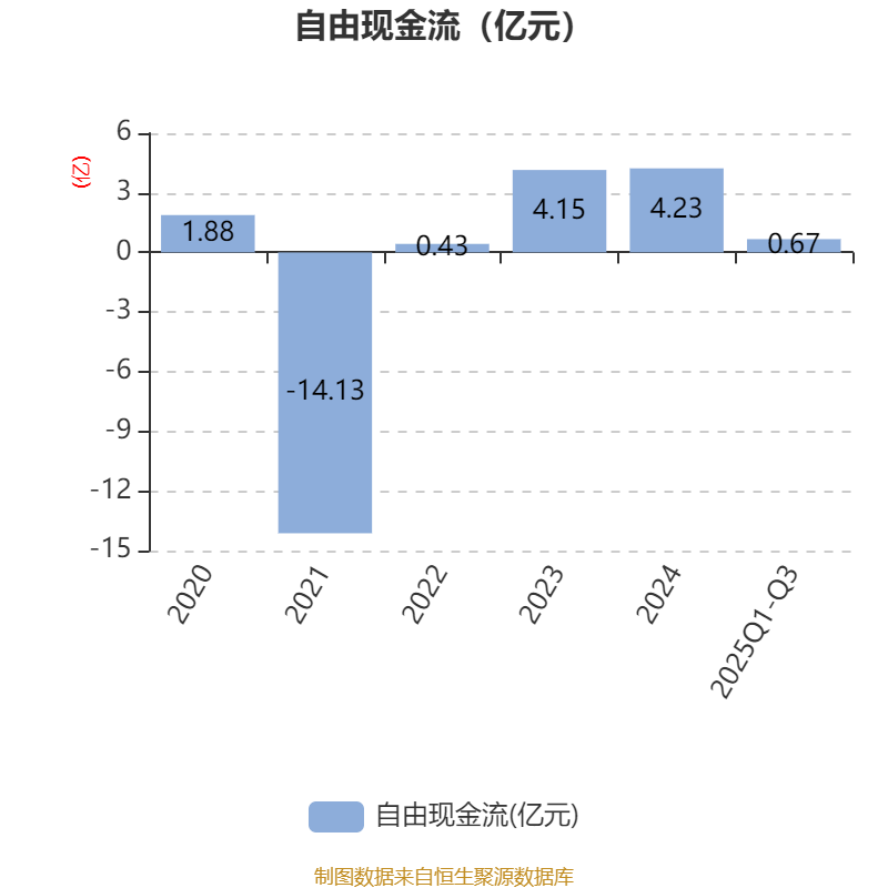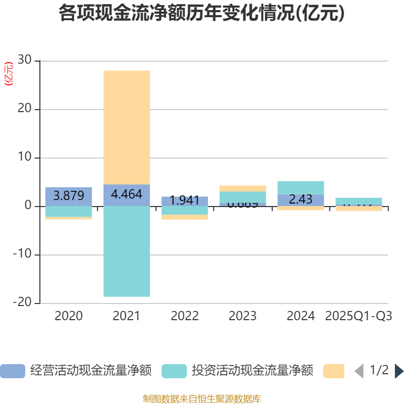 2025年前三季度,公司经营活动现金流净额为3116.83万元,同比下降80.79%;筹资活动现金流净额-1.01亿元,同比减少1.34亿元;投资活动现金流净额1.38亿元,上年同期为1.34亿元。