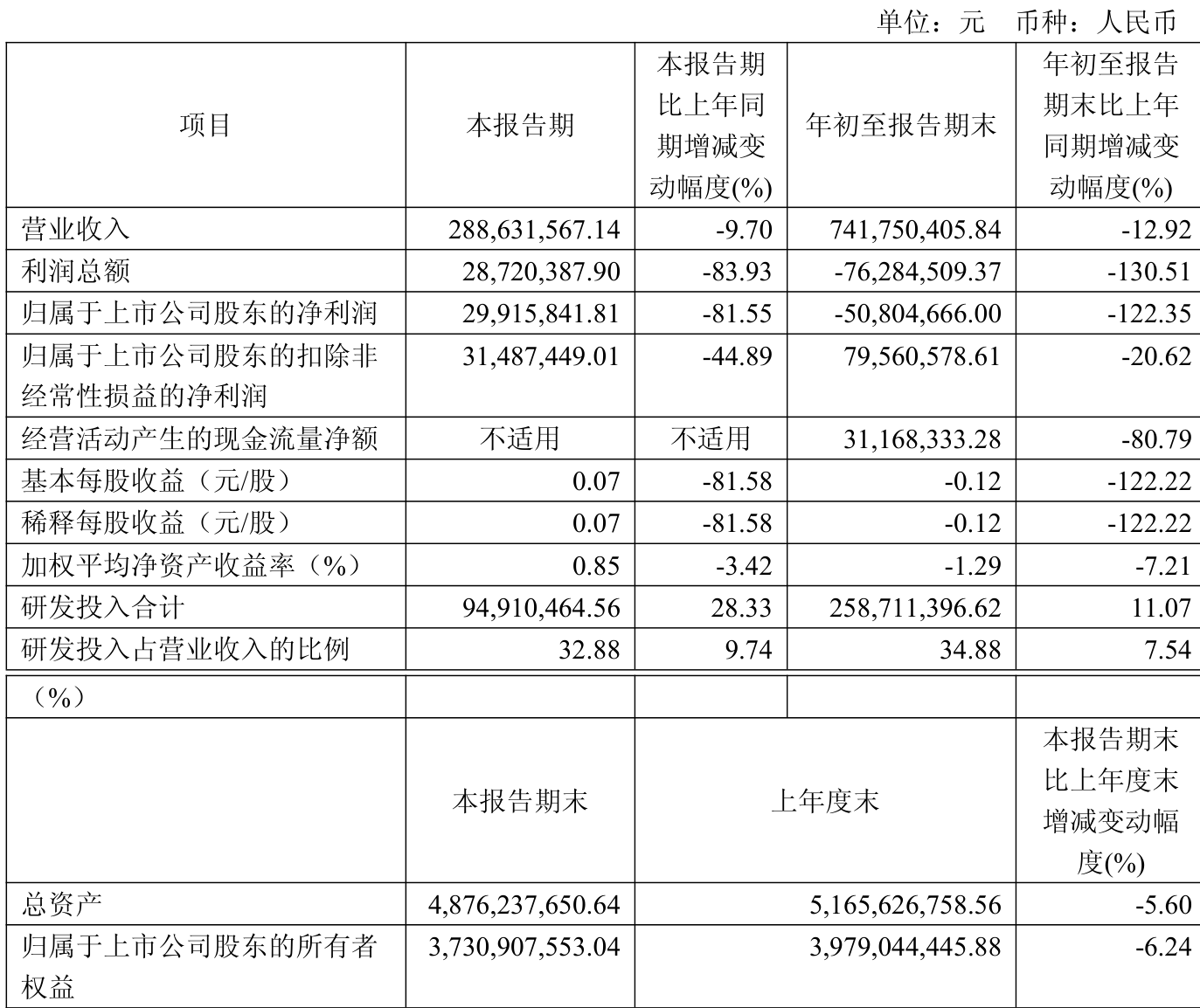 中证智能财讯汇宇制药(688553)10月30日披露2025年第三季度报告。前三季度公司实现营业总收入7.42亿元,同比下降12.92%;归母净利润亏损5080.47万元,上年同期盈利2.27亿元;扣非净利润7956.06万元,同比下降20.62%;经营活动产生的现金流量净额为3116.83万元,同比下降80.79%;报告期内,汇宇制药基本每股收益为-0.12元,加权平均净资产收益率为-1.29%。